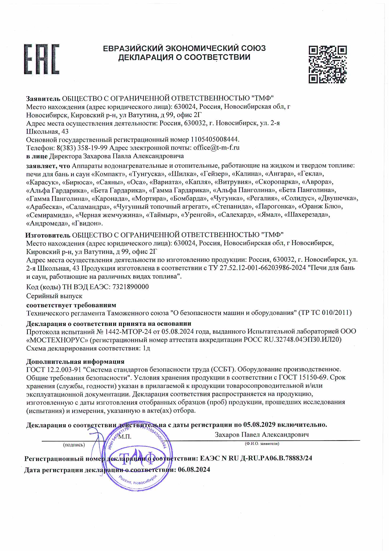 На все печи «Саяны Inox» распространяется трехлетняя «Железная гарантия» на целостность металла и сварных швов топки.